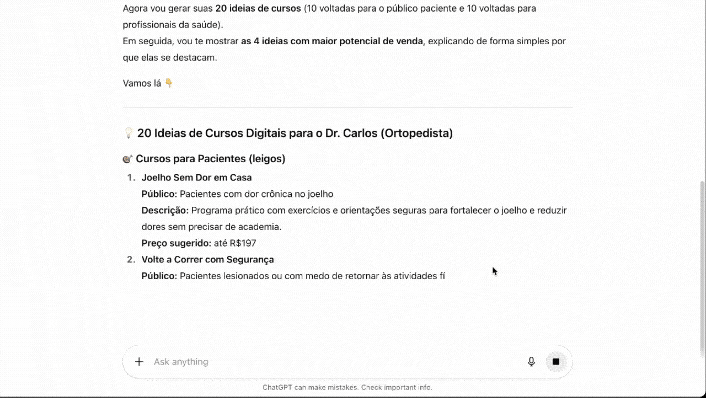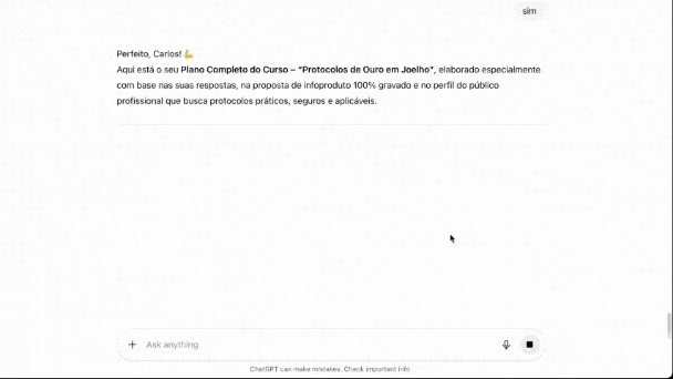Assim que escolhe sua ideia, você recebe o plano pronto do curso: nome, promessa central, estrutura com módulos e aulas, sugestão de bônus estratégicos e valor ideal para iniciar as vendas. É o seu mapa de clareza — simples de seguir, impossível de travar.